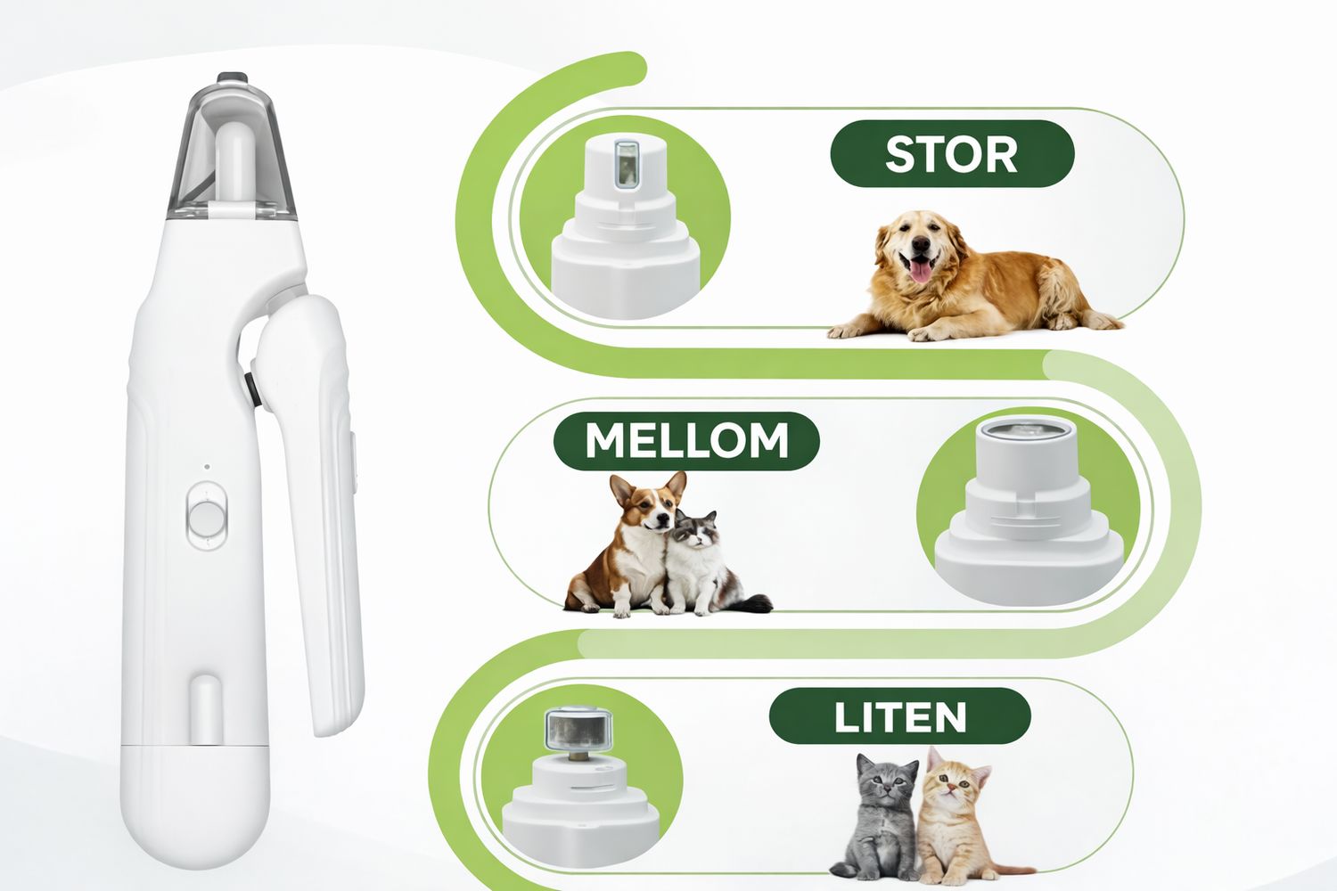 Klotrim™ Smart leveres med tre forskjellige slipehoder som gjør det enkelt å tilpasse etter størrelsen på kjæledyret ditt.